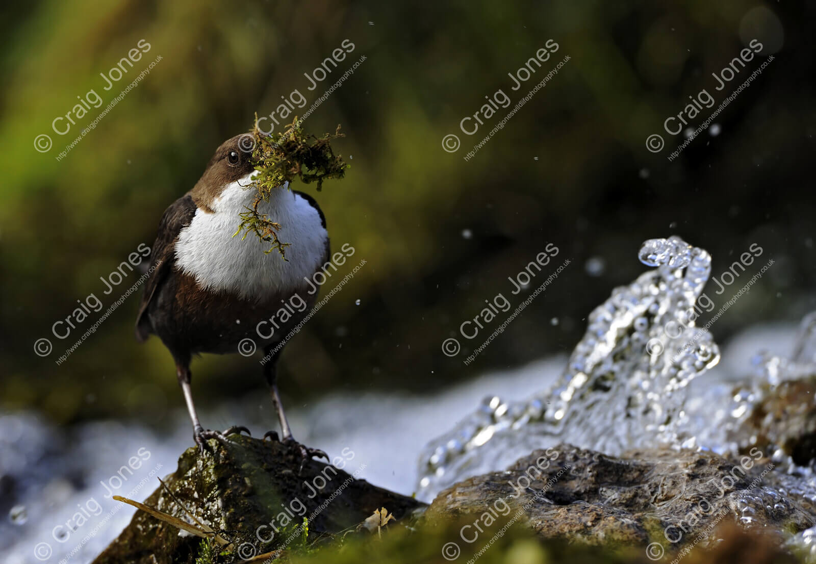 A Dipper seen with a beak full of nesting material, taken in the Peak District National Park, England.